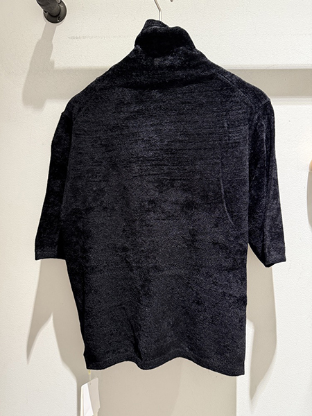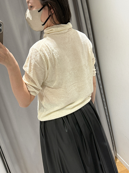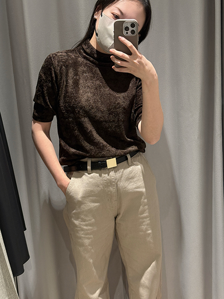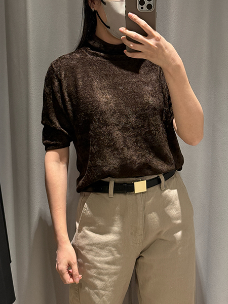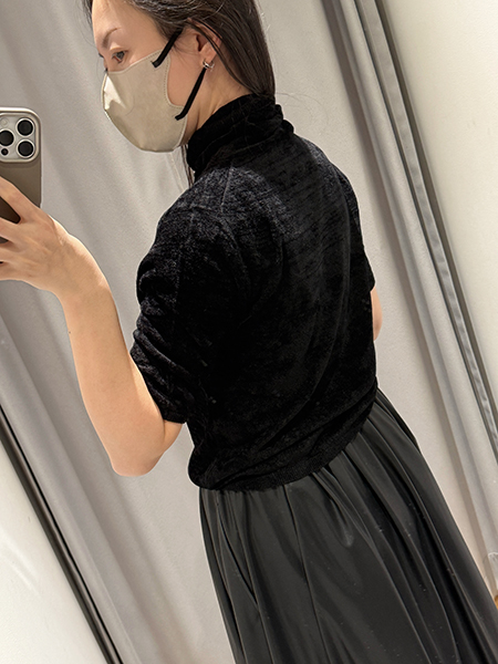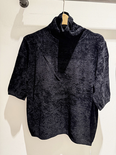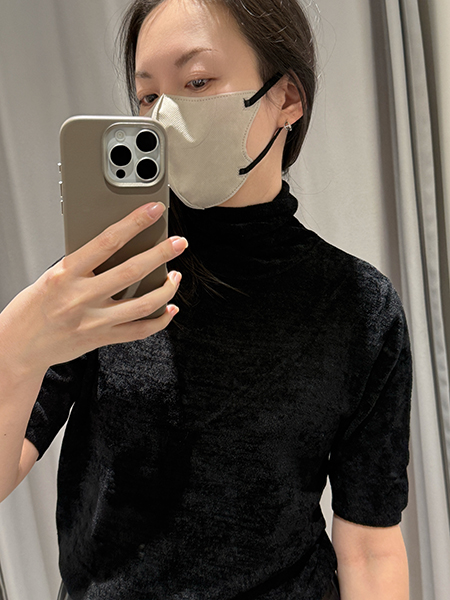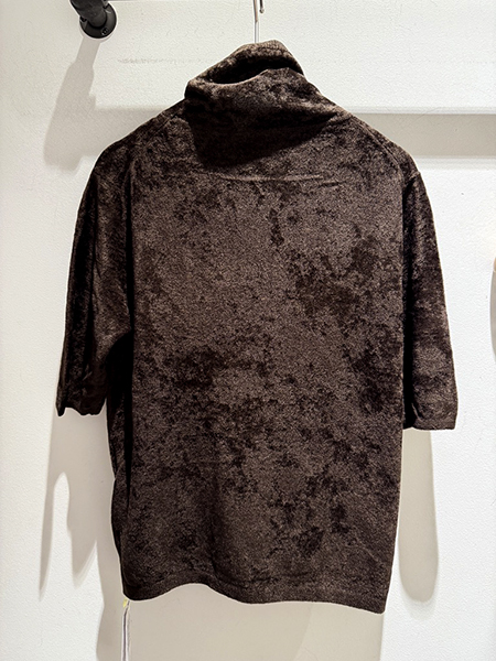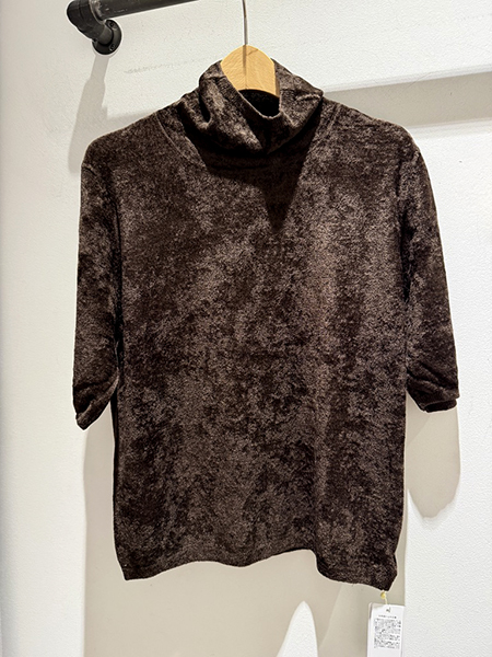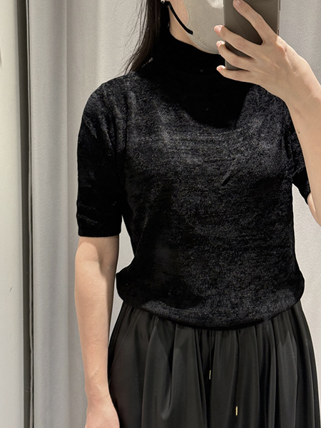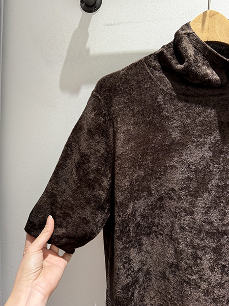這款絲絨針織使用上等的人造絲絨毛天,透過天竺編織,創造出溫暖且巧妙的微微透膚的高領套頭上衣。