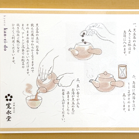 寬永堂使用丹波篠山產的「丹波黑」和北海道產的「光黑」兩種黑豆,收穫成熟後混合,味道濃郁,再加上不粉碎的烘焙,可以一粒一粒保留著美麗的形狀享受到沒有味道的味道,工匠從產地到製造都很講究,外觀也很好的黑豆茶最適合作為禮物。
