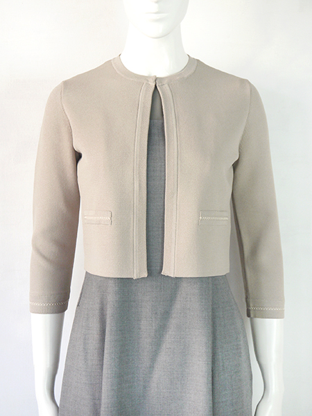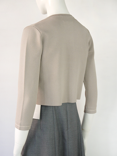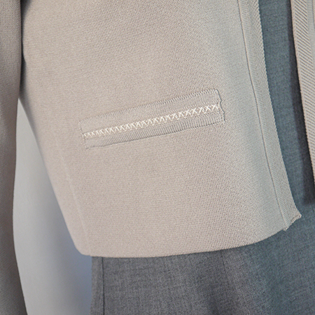 開放式門襟,無鈕扣設計,領口處有旗袍鉤可扣起,只有門襟上方扣起這讓外套有著輕鬆的正面輪廓。